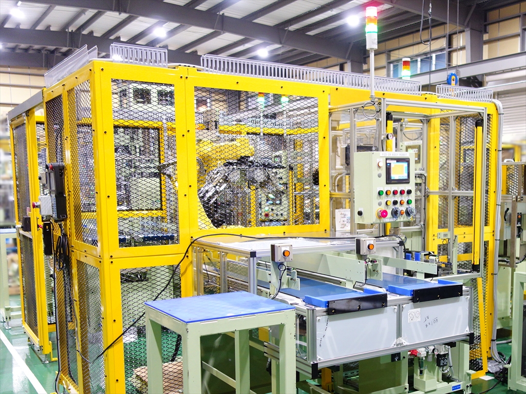 A facility that integrates the cleaning, press-fitting and marking processes of automobile parts. The parts are automatically moved between each process using a robot.